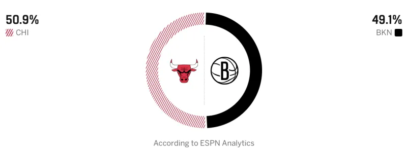 赛前,美媒ESPN预测本场比赛,公牛胜率50.9%,篮网胜率49.1%。